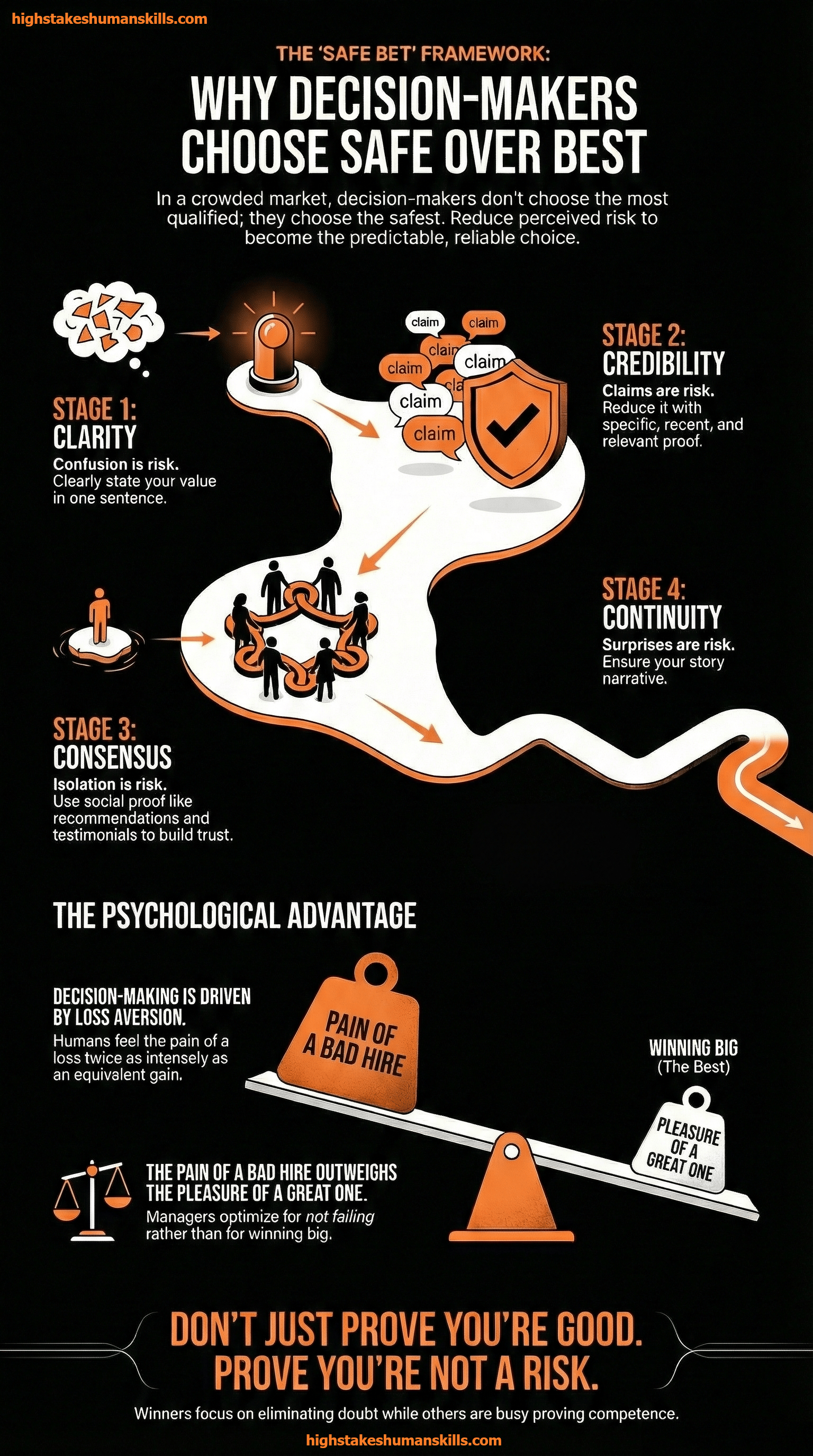 Decision-makers, whether they're hiring managers, clients, or investors, run an unconscious risk calculation before choosing anyone. Your job is to reduce perceived risk at every stage.
