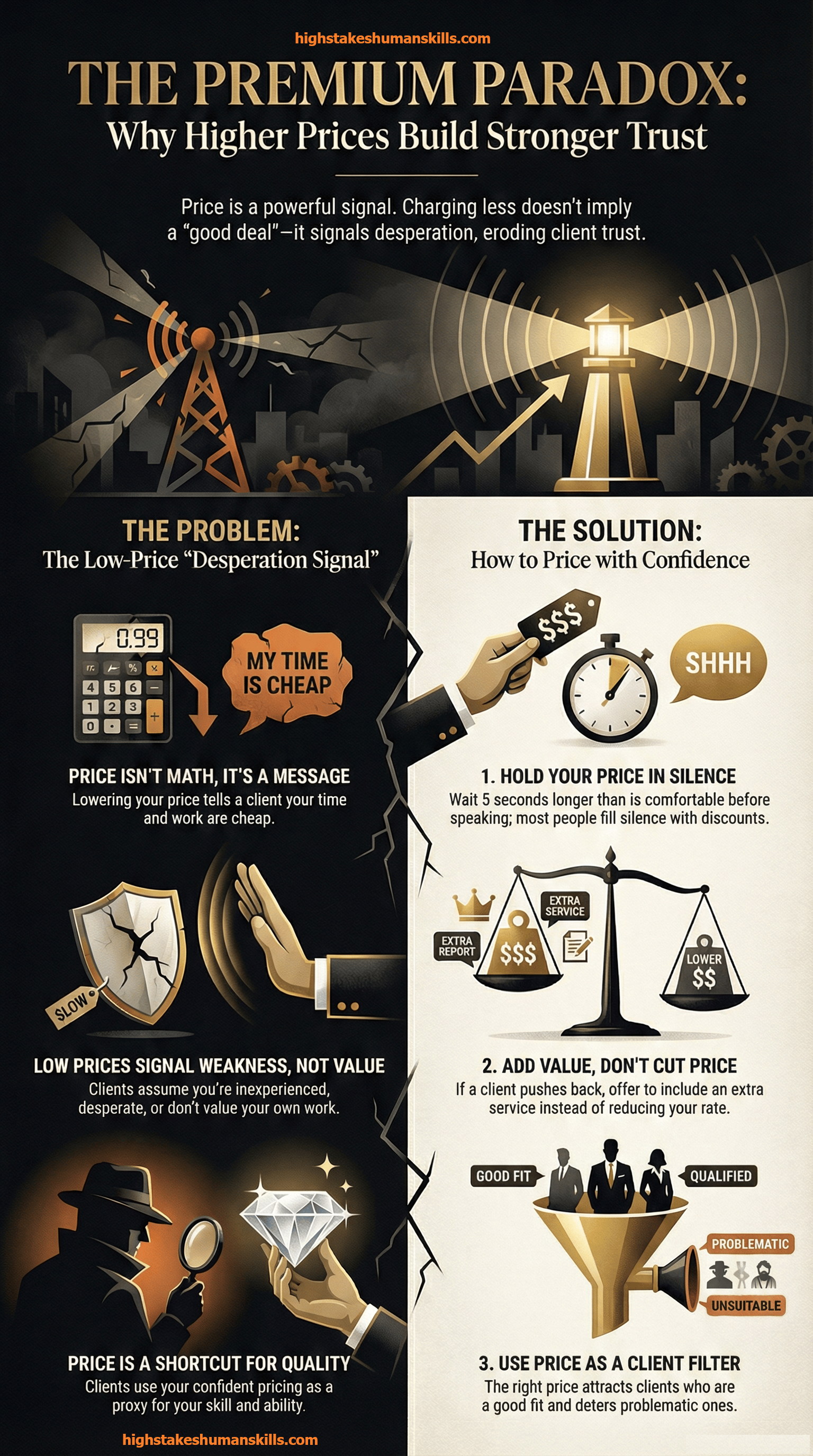 People use price as a quality heuristic when they can't evaluate skill directly. If they could assess your expertise perfectly, price wouldn't matter. But they can't. So they use your confidence in your own pricing as a proxy for your confidence in your ability.